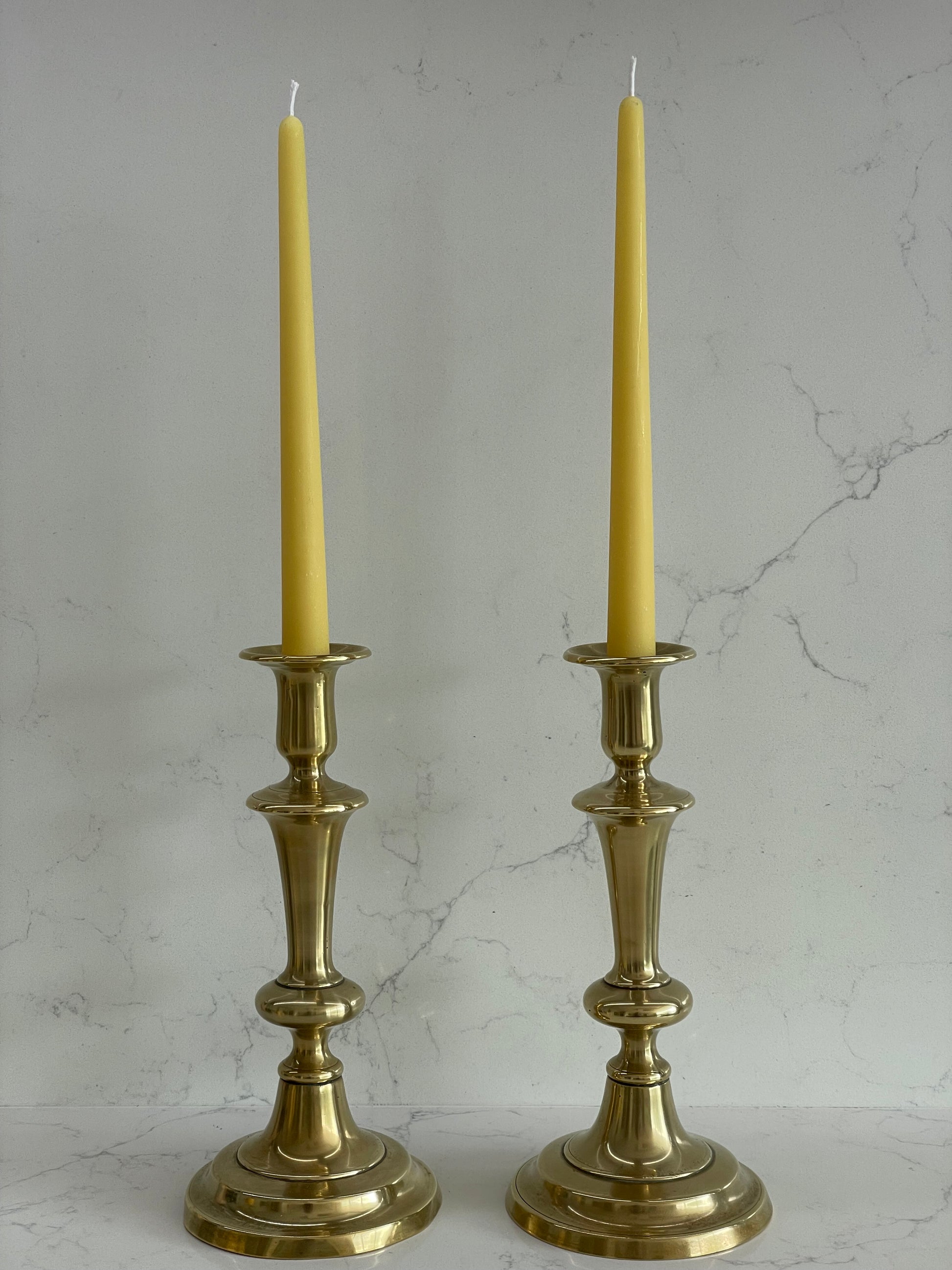 Stunning pair of antique round base brass candlesticks with 4 matching pure beeswax dinner candles, 19th Century, Mantel candlesticks 9"