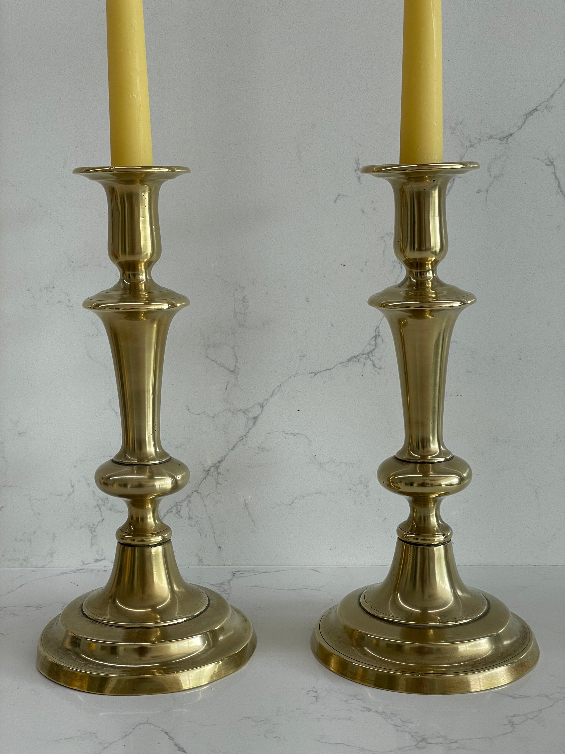 Here we have a stunning pair of antique C19th brass candlestick holders with trumpet shaped base, shaped columns and circular drip trays. Beautiful, quality pair of late 19th century solid brass (combined weight 864g) candlesticks, with circular bases and shaped stems; a great addition to any setting . Unfortunately the original push rod candle ejector on one of the sticks is no longer present. Please look at the photos carefully to appreciate the highly skilled craftsmanship. They are beautifully, highly polished by hand and ideal for any dinner party or mantel, particularly when combined with their 4 hand poured matching long burning dinner candles - made from the purest, highest quality beeswax sourced exclusively from small scale London beekeepers.