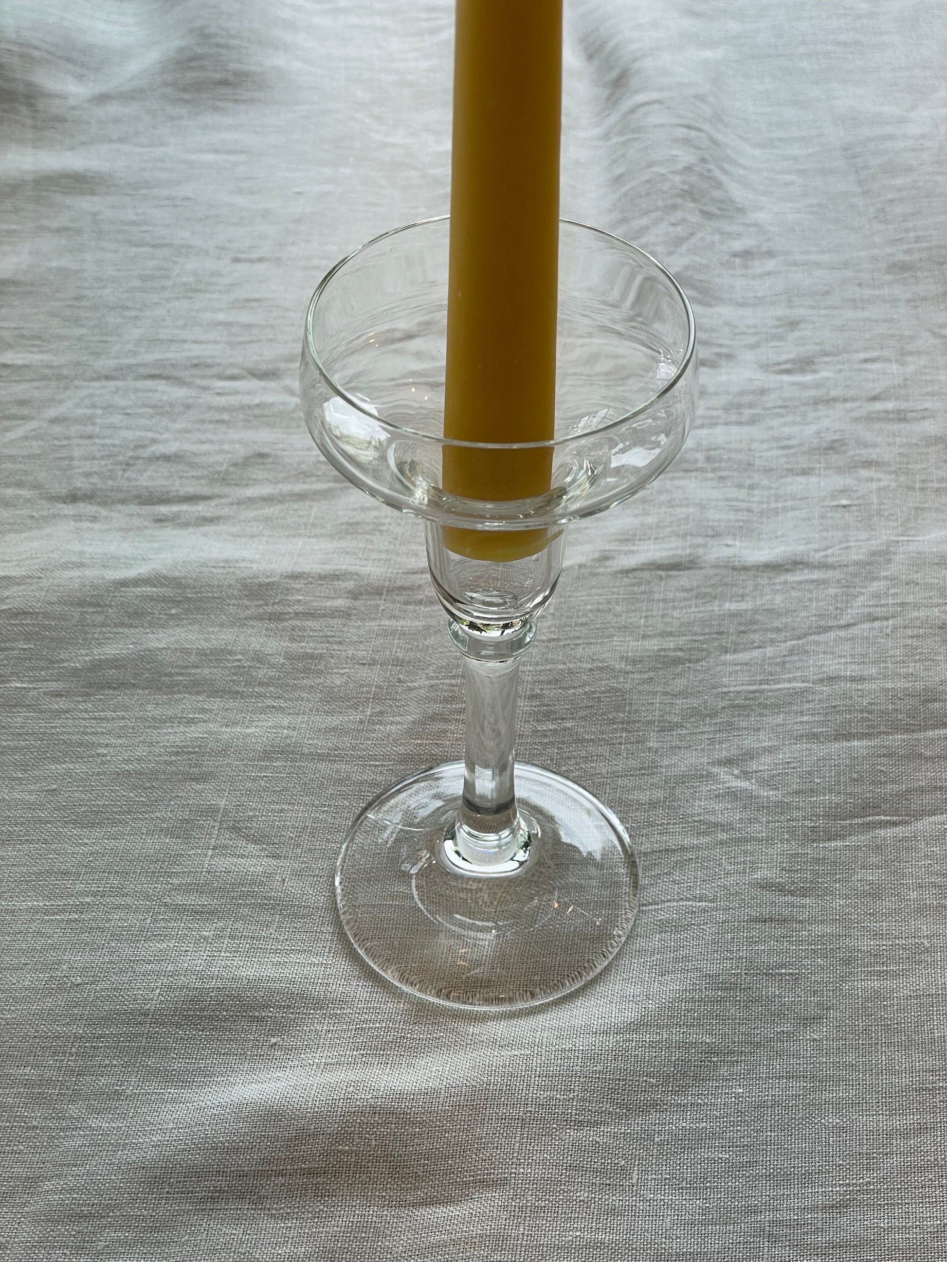 A stunning unique Scandi style glass candlestick holder. It features a circular base and a tazza, a saucer like elegant bowl, perfect for showing off our natural, pure beeswax London dinner candle. It is this feature that makes this holder so distinctive and attractive.