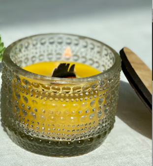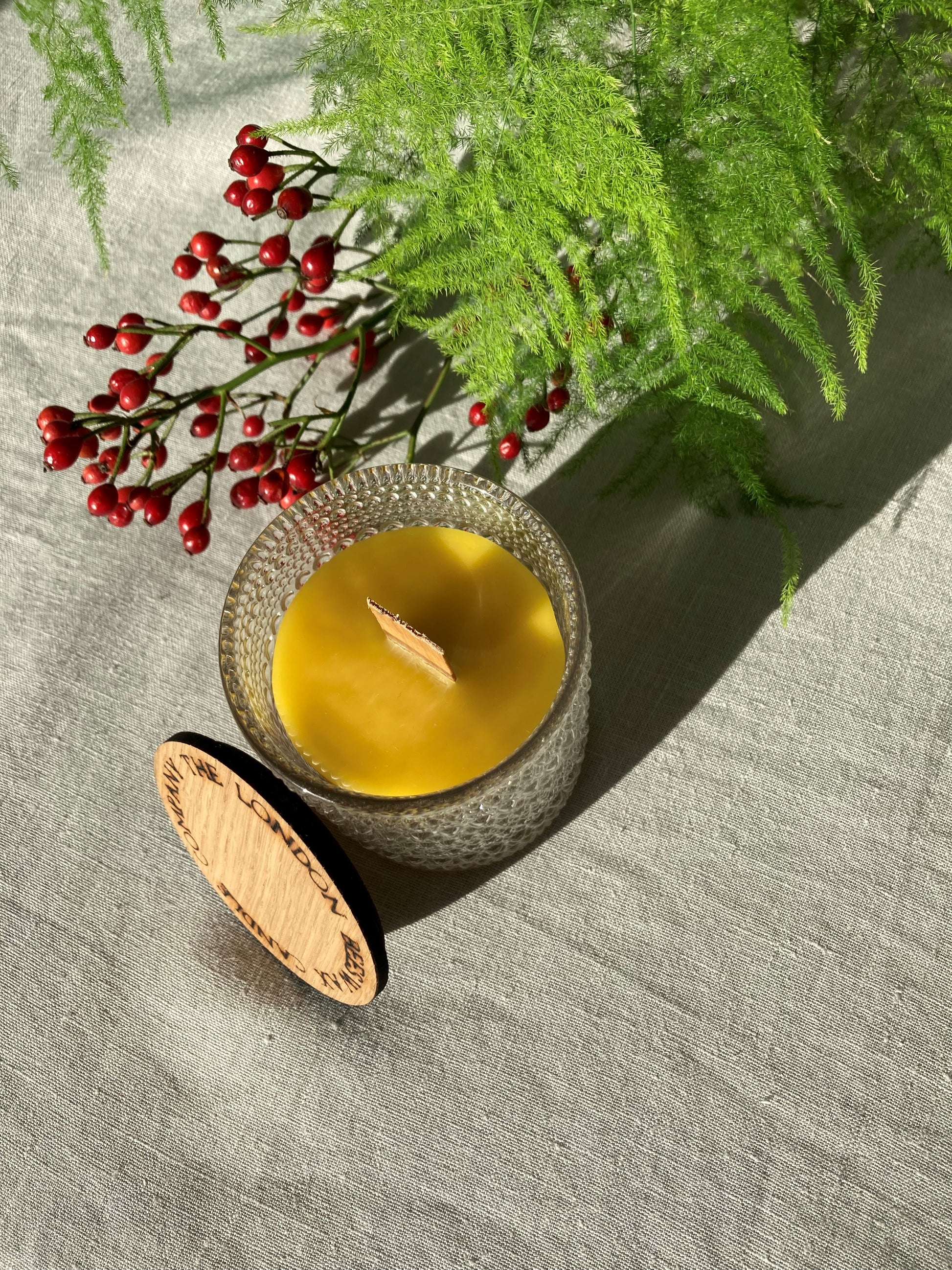 - 1 luxury pure beeswax wood wick glass container candle with oak lid (2 inch height)