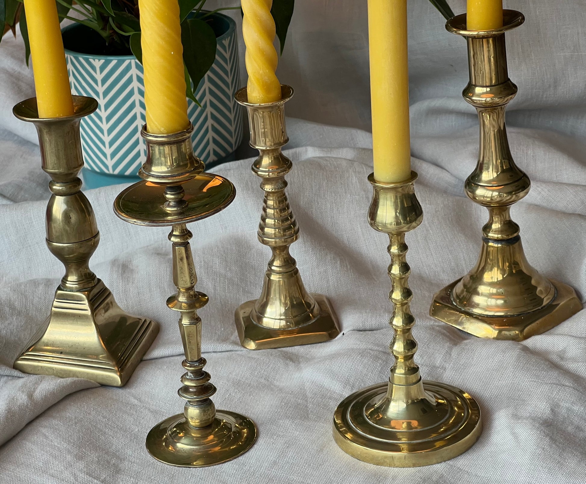 Five beautiful, unique antique candlestick holders with a matching pure London beeswax candle. Vintage brass candlestick gift. Dinner candle gift set. Eco beeswax candle gift. Unique gift set. Victorian ornate candle holder.