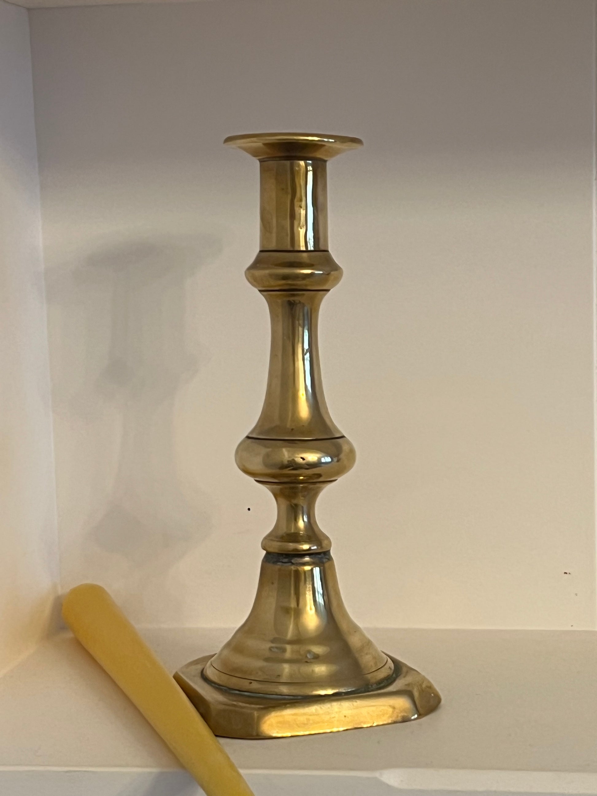 Here we have an exquisite antique brass candlestick holder in the baluster form. Beautiful, quality solid heavy brass ( weight 280 grams) candlestick, with the square base and shaped stem; an eye-catching addition to any setting . Unfortunately the original push rod candle ejectors are present but no longer working.