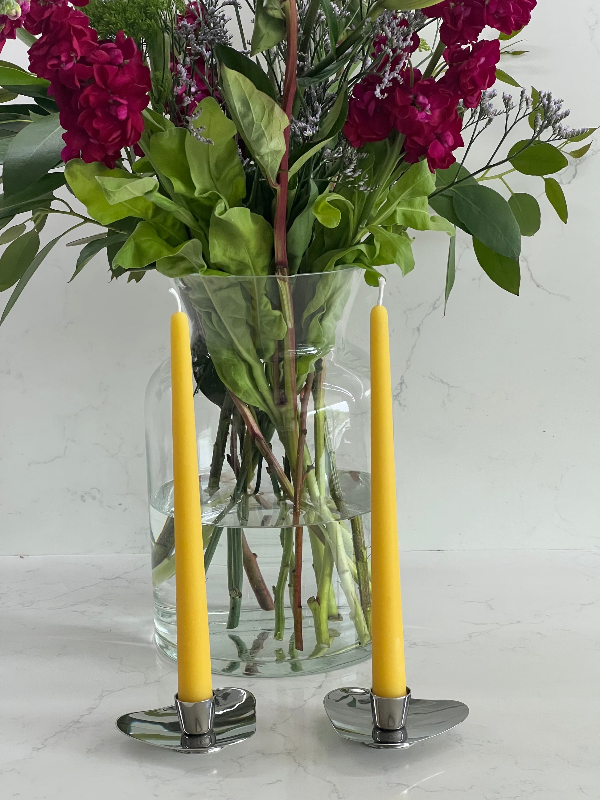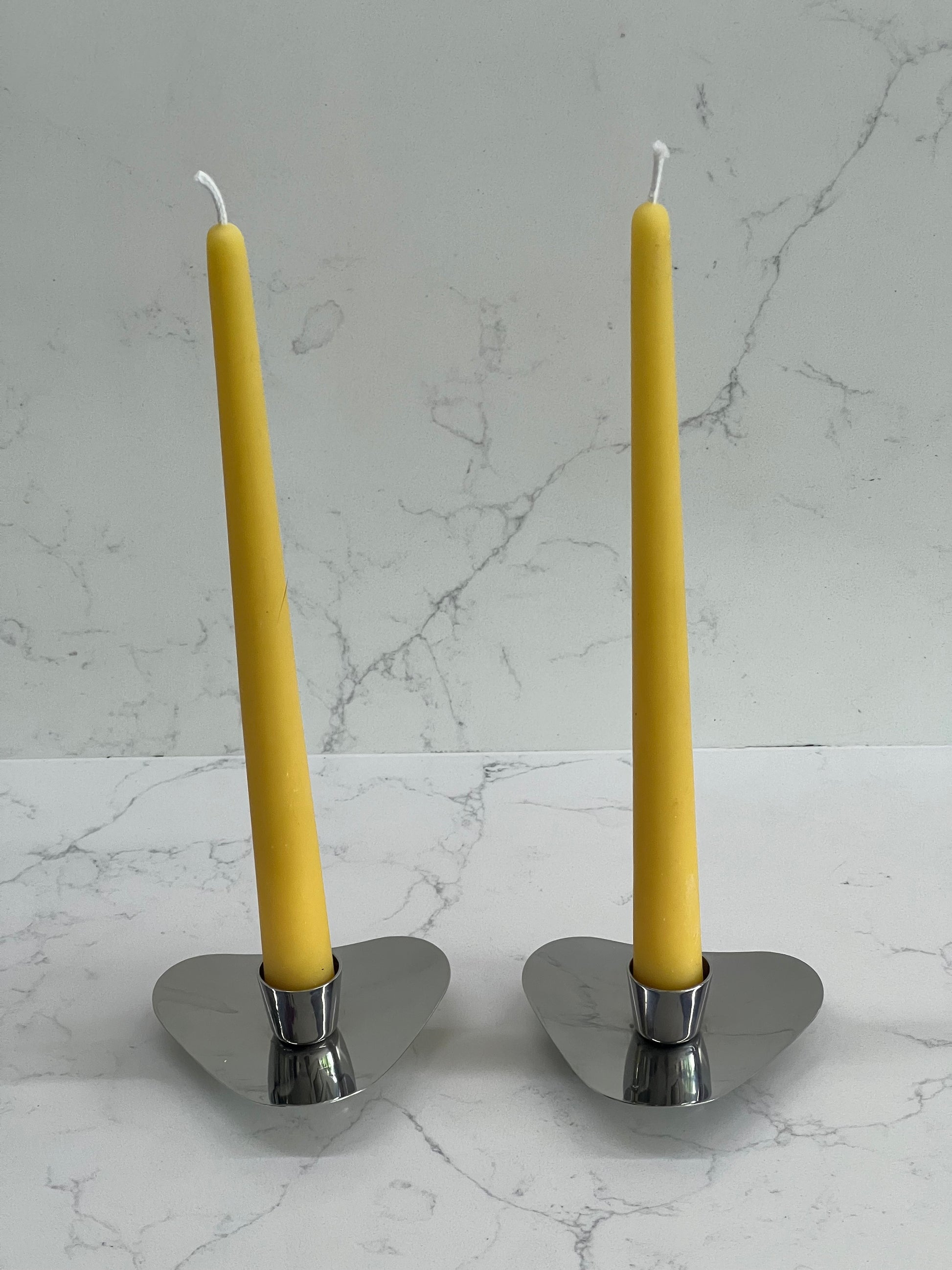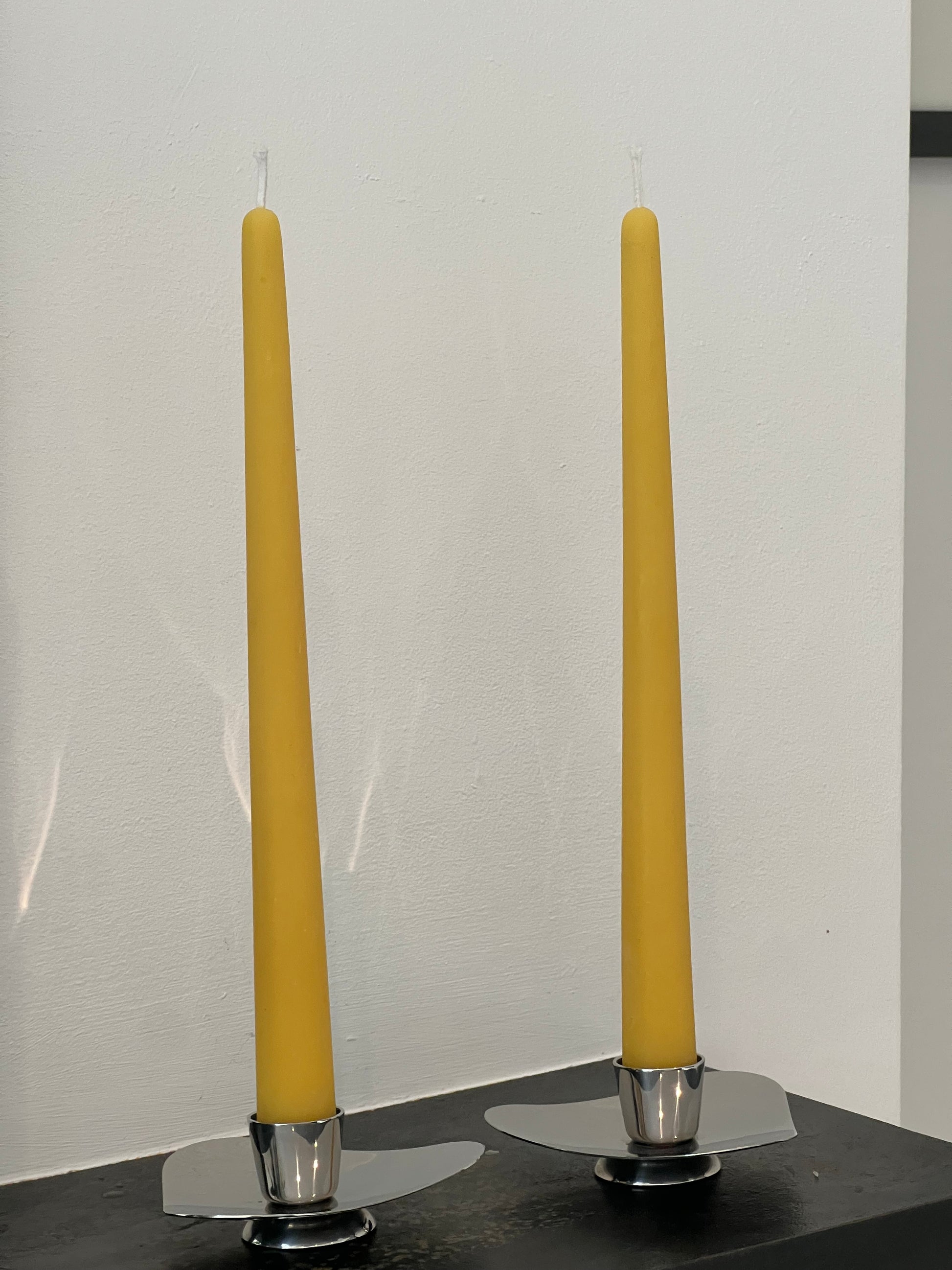 A stunning pair of stainless steel mid-century modern candlestick holders by Robert Welch for Old Hall from 1958. Vintage candlestick holders with 2 matching pure London beeswax candles. Dinner candle gift set. Eco beeswax candle gift. Unique gift set