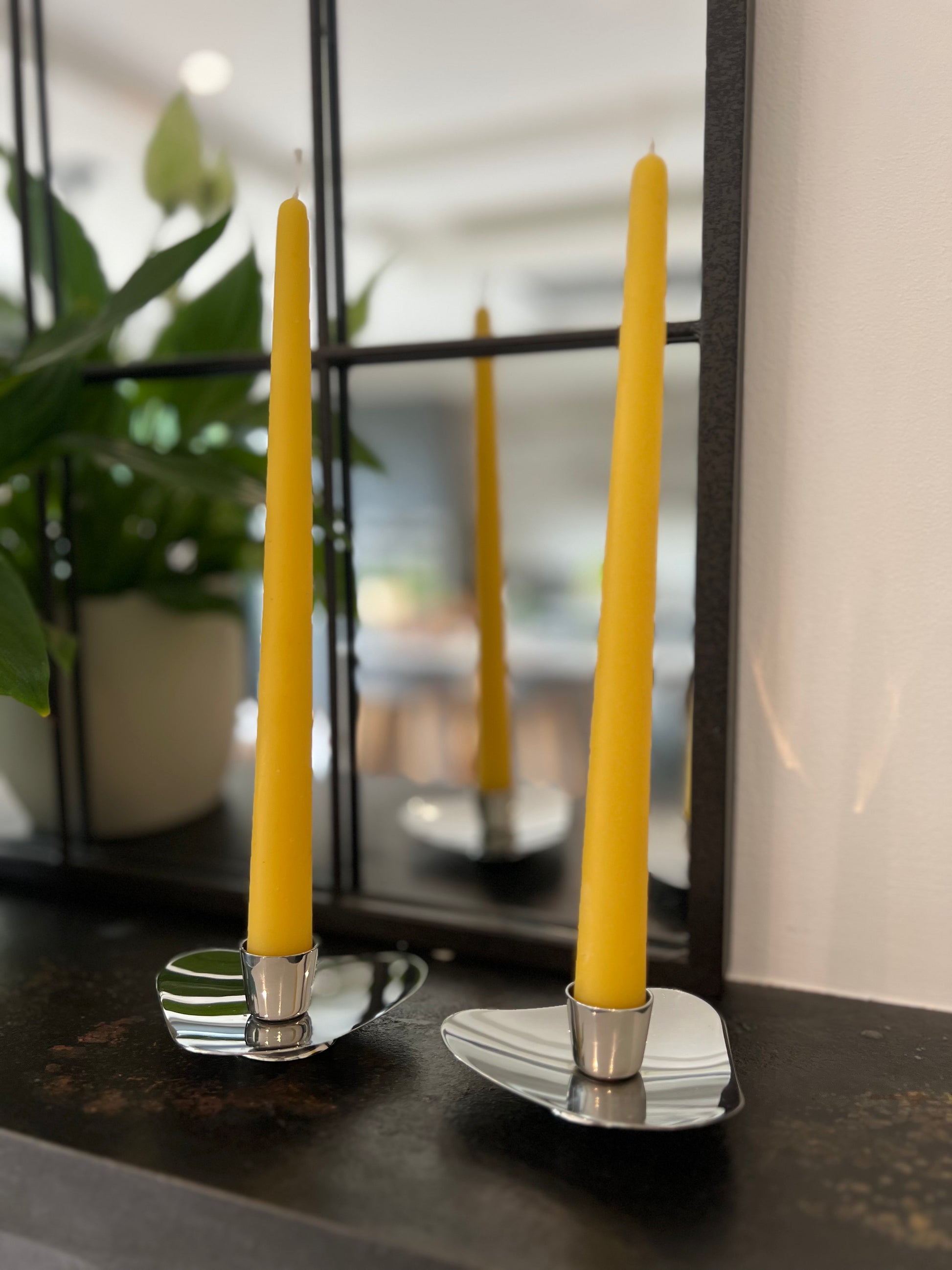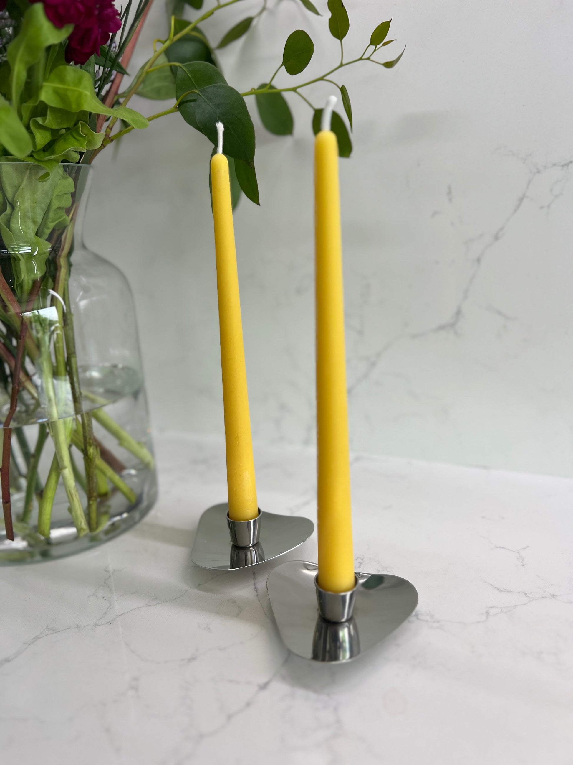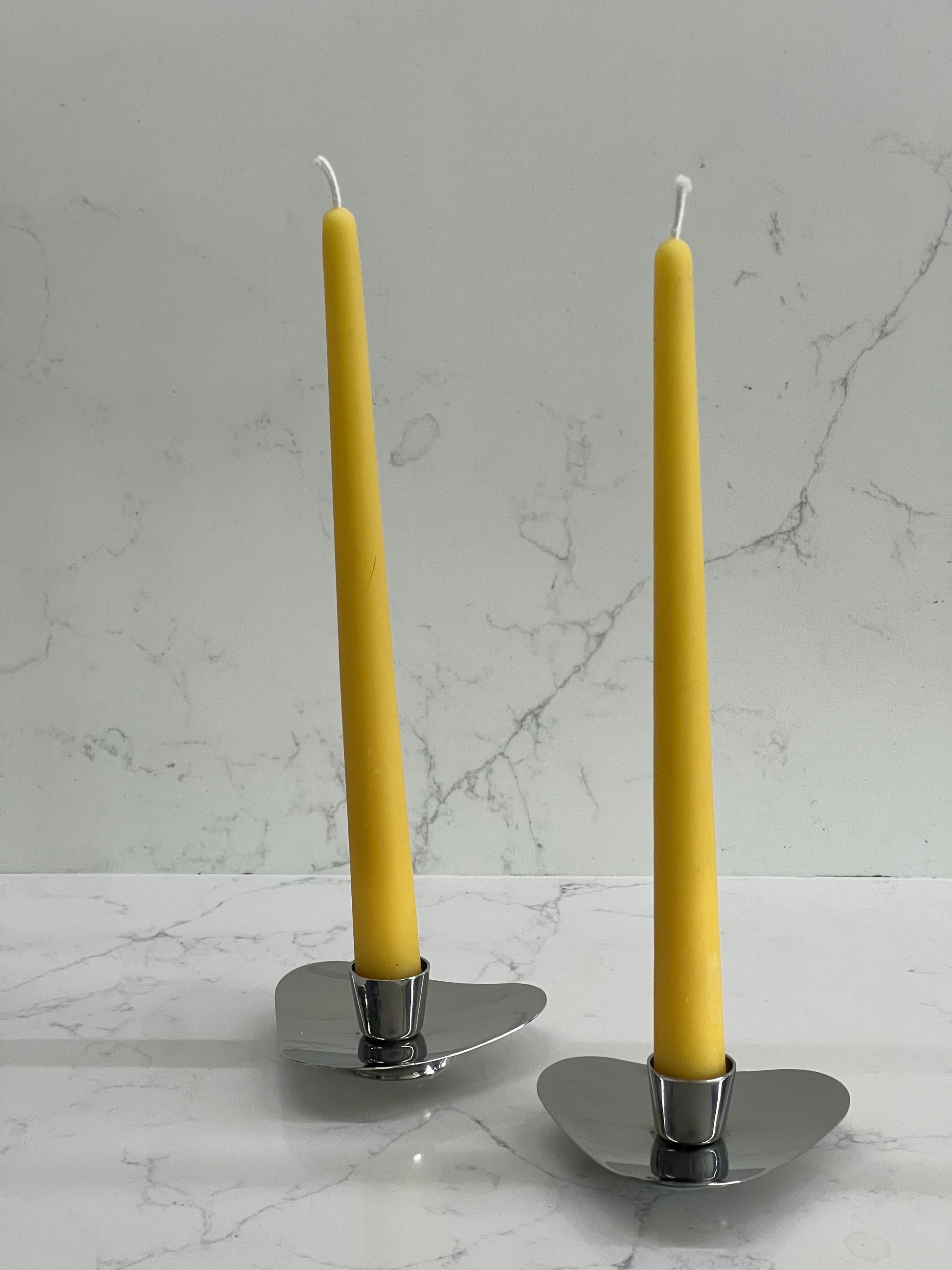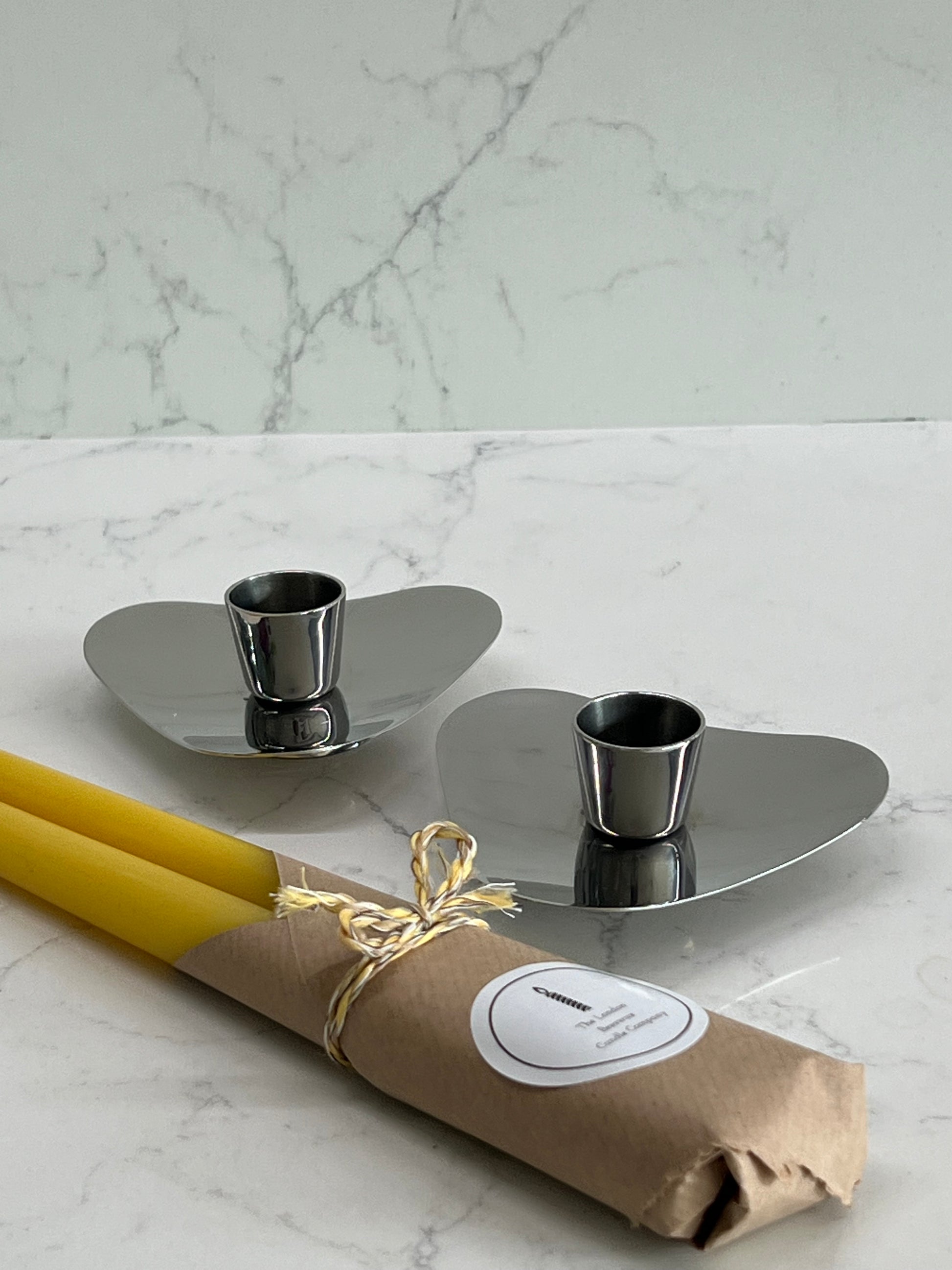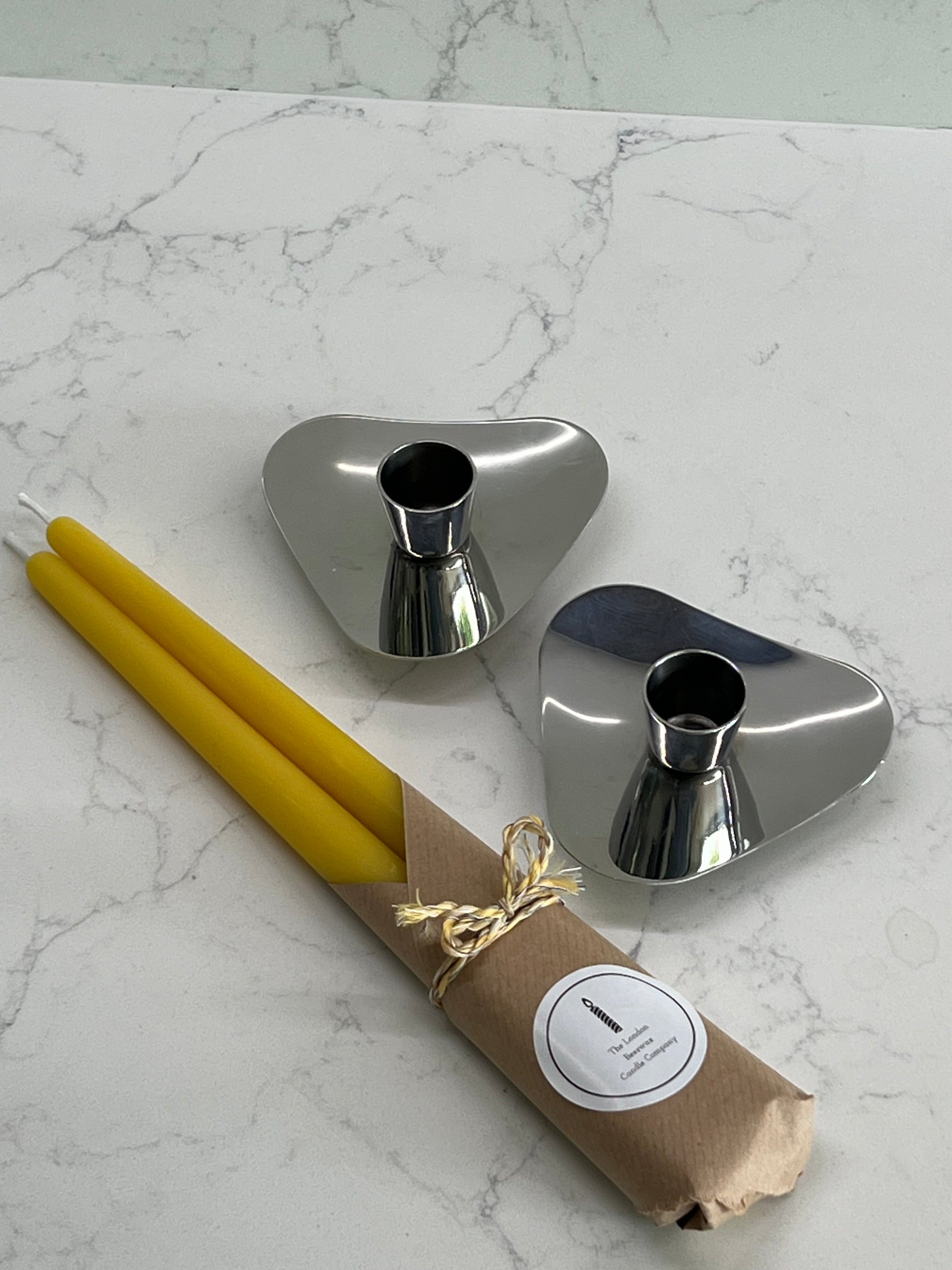The two candlestick holders come as a gift set with 2 hand poured tall taper candles made from pure London beeswax each 24cm long.